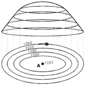 | On représente les champs de pression dans un plan horizontal (le niveau de la mer le plus couramment) par les lignes d’égale pression appelées isobares . Ces lignes forment des surfaces concentriques autour du centre de la dépression ou de l’anticyclone. |
